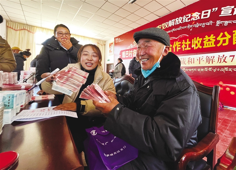 拉薩市城關區(qū)納金鄉(xiāng)嘎巴村分紅儀式現(xiàn)場?!∥鞑厝請笥浾摺〉┰鎏m澤 攝