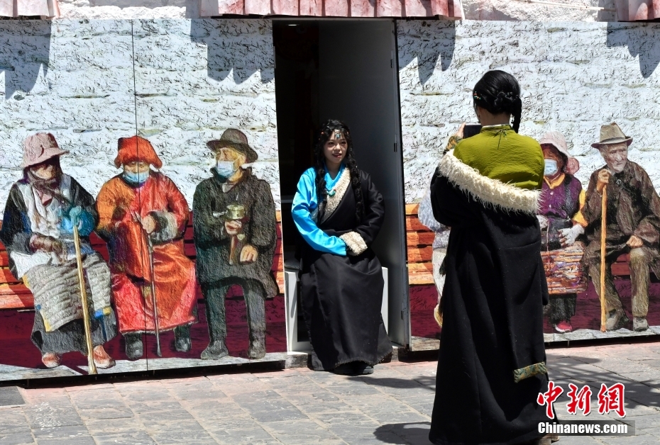 4月23日,身著藏裝的游客在拉薩八廓街拍照留念。隨著西藏旅游旺季臨近,中外游客來到雪域高原觀光旅游。中新社記者 李林 攝