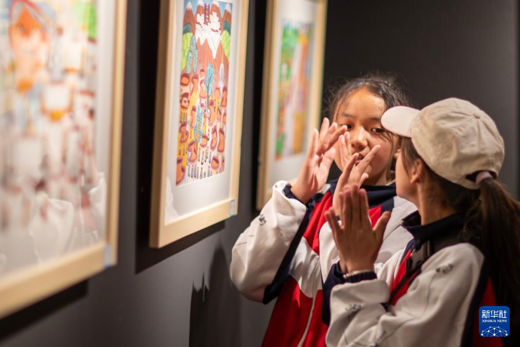 6月5日,拉薩市特殊教育學(xué)校的孩子在參觀作品展覽時用手語交流。新華社記者 姜帆 攝