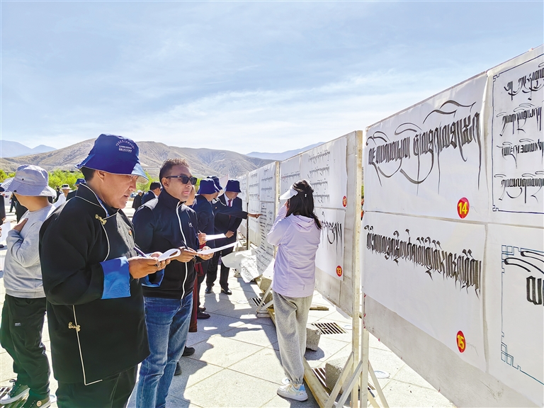 在謝通門縣開展的書法、繪畫、攝影比賽中,評委在為作品打分。