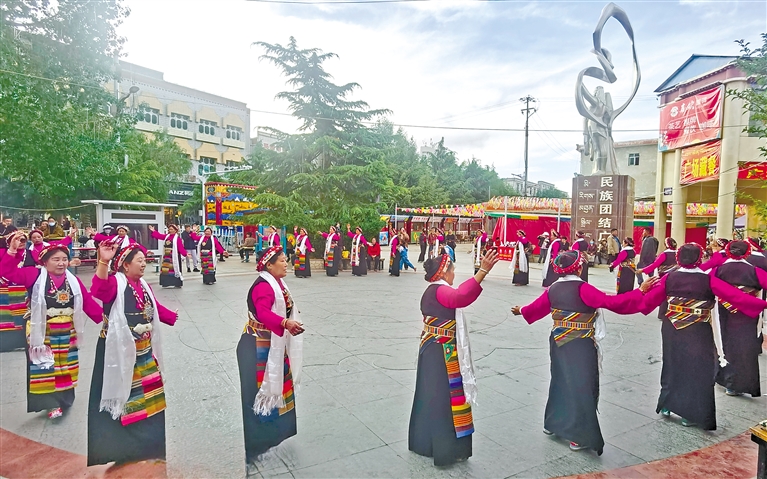 傍晚時分,日喀則市各族干部群眾在民族團結廣場跳鍋莊。