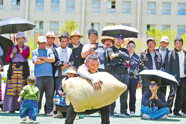 桑珠孜區(qū)城北街道舉辦慶祝第八個“日喀則市民族團結進步日”暨“全民來健身 健康你我他”社區(qū)運動會。這是參賽選手在進行抱石頭比賽。