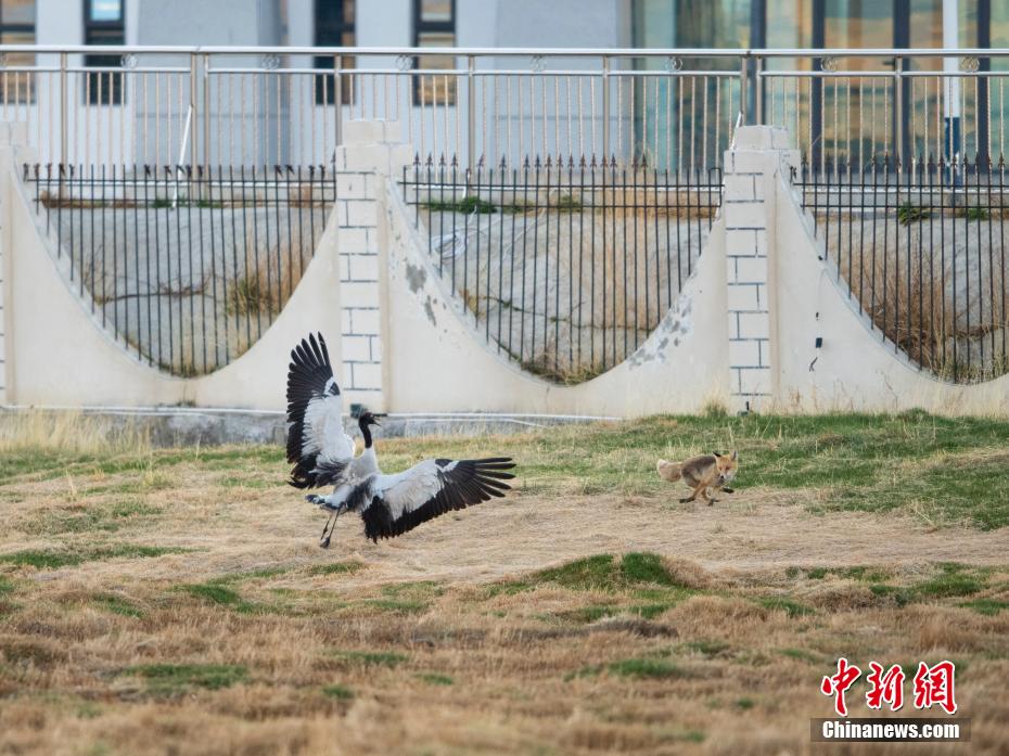 6月12日,西藏那曲市申扎縣濕地里一只黑頸鶴在驅(qū)趕狐貍。申扎縣,平均海拔超過4500米,是黑頸鶴在中國的主要繁殖地之一。每年4月到6月,成群的黑頸鶴會來到這里,筑巢、孵化、養(yǎng)育下一代。近年來,為了保護這些珍貴的生靈,申扎縣采取了一系列措施,設(shè)立了監(jiān)測站,對黑頸鶴的棲息地進(jìn)行24小時監(jiān)控,確保它們的繁殖不受干擾。黑頸鶴是國家一級保護動物,也是世界上唯一一種生長、繁殖在高原的鶴類。貢嘎來松 攝