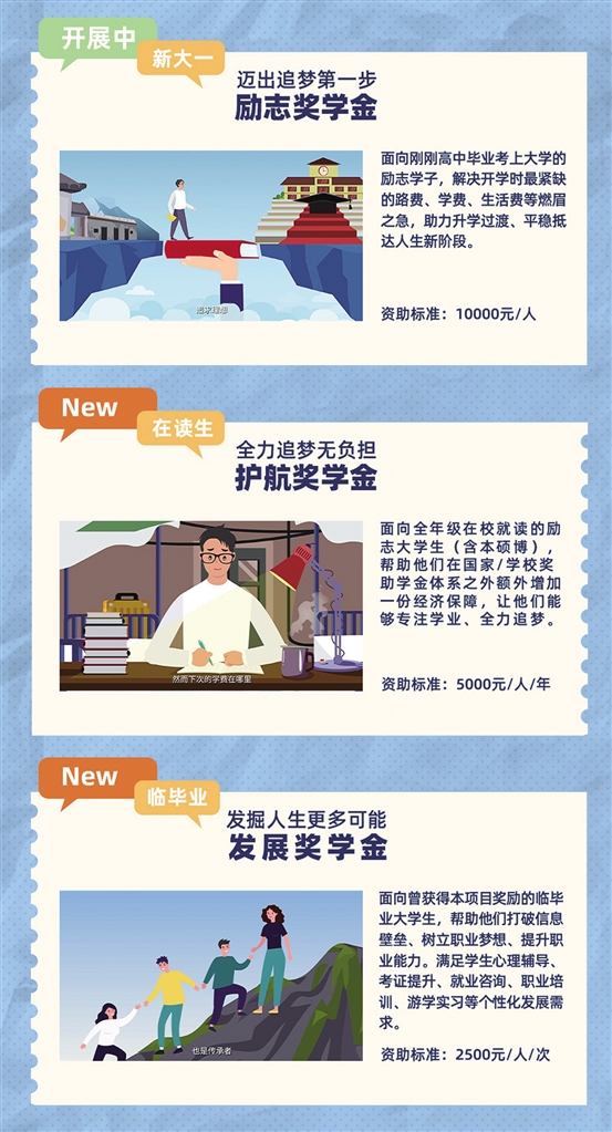 今年高考分?jǐn)?shù)揭曉在即,項(xiàng)目升級為“夢想+”大學(xué)生助力計(jì)劃,除繼續(xù)重點(diǎn)獎勵(lì)剛考上大學(xué)的勵(lì)志新生每人1萬元“勵(lì)志獎學(xué)金”外,之后學(xué)生在本碩博直到臨畢業(yè)期間,如有困難仍可繼續(xù)申請“護(hù)航獎學(xué)金”(5000元/人/年)和“發(fā)展獎學(xué)金”(2500元/人/次)。為了能夠讓更多學(xué)子獲得獎學(xué)金,今年項(xiàng)目繼續(xù)聯(lián)合杭州嘉互助學(xué)基金會開通公募渠道,公募款將100%用于獎勵(lì)勵(lì)志學(xué)子。