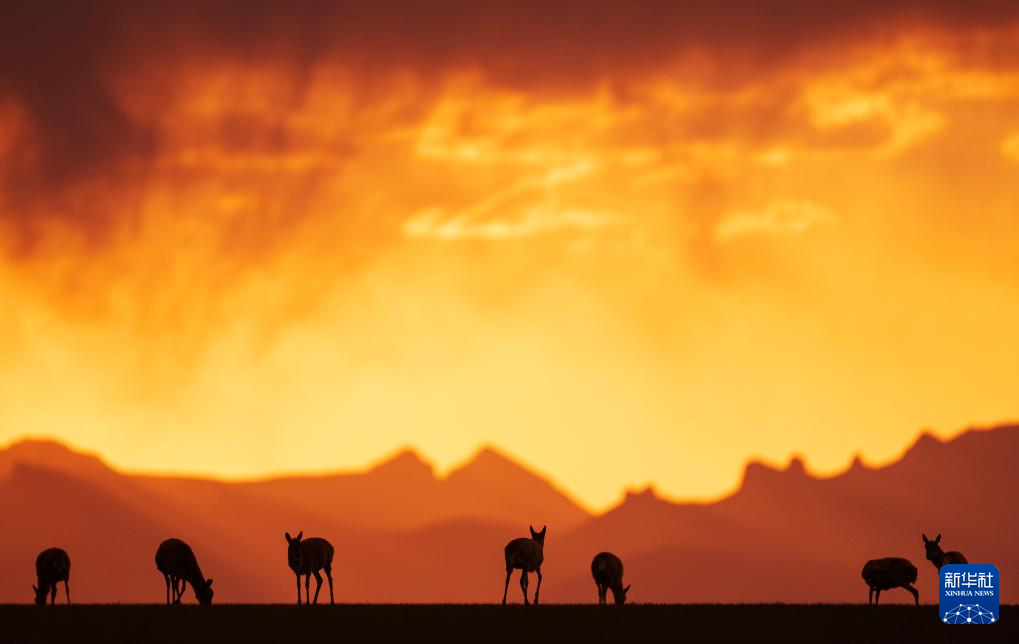 晚霞中魯確塘草原上待產的藏羚羊(6月16日攝)。新華社記者 費茂華 攝