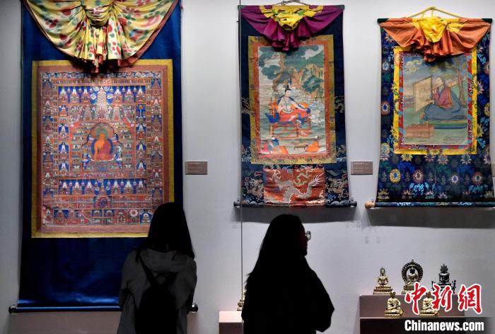 隨著西藏旅游旺季的到來,“高原城市會客廳”西藏博物館也迎來參觀熱潮。圖為6月19日,觀眾正在欣賞展陳的唐卡。中新社記者 李林 攝