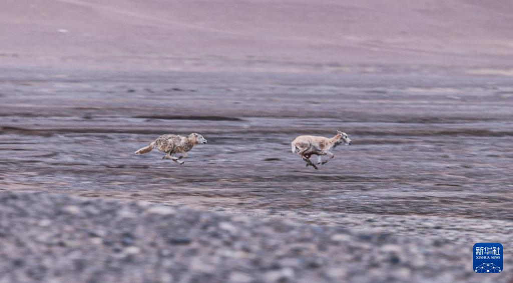 在羌塘國家級自然保護(hù)區(qū),一只雄性藏羚羊奔向雌性(2023年12月16日攝)。新華社記者 姜帆 攝