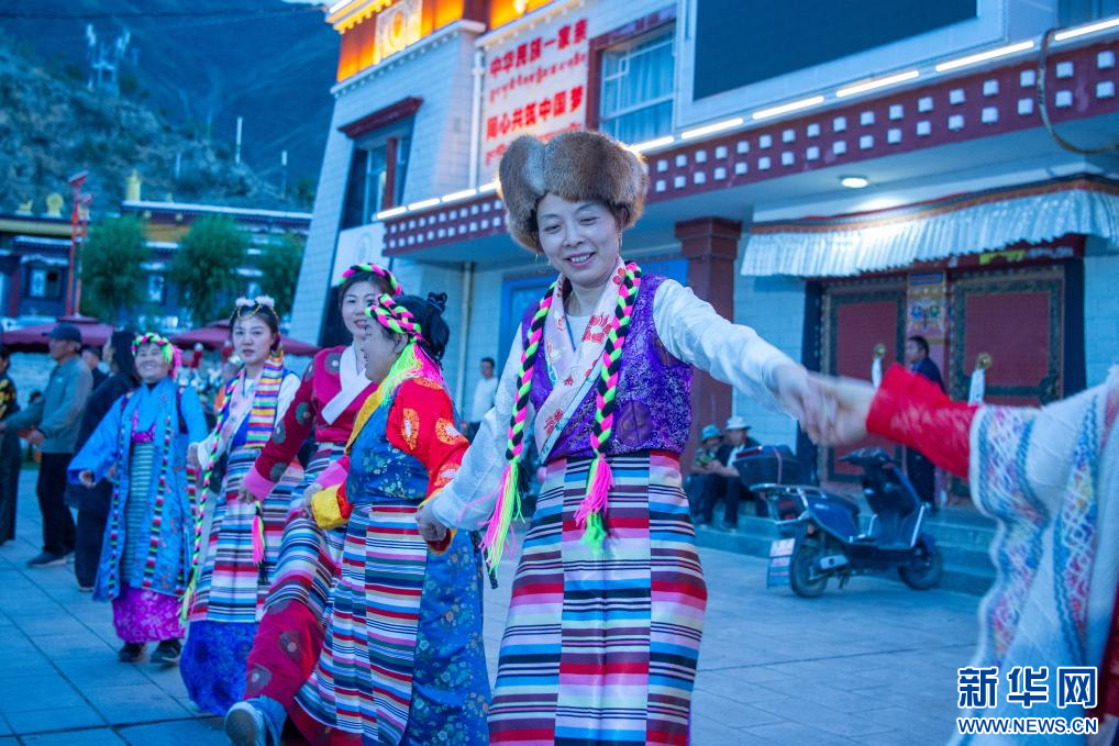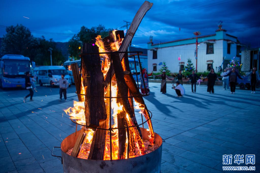 6月24日,游客在扎西曲登社區(qū)廣場體驗篝火廣場舞。新華網(wǎng) 旦增努布 攝
