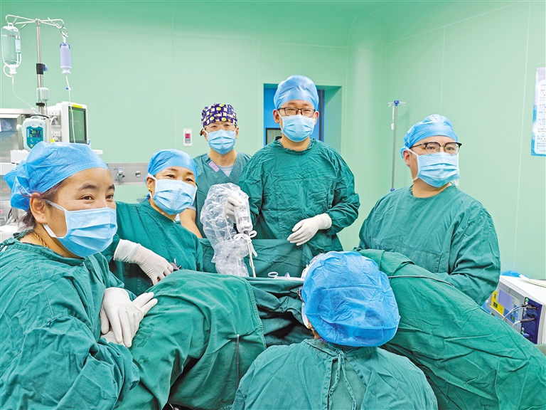 上海援藏醫(yī)療專(zhuān)家隋孟松(右一)帶領(lǐng)本地婦科醫(yī)生開(kāi)展日喀則市首例腹腔鏡下全子宮切除手術(shù)。