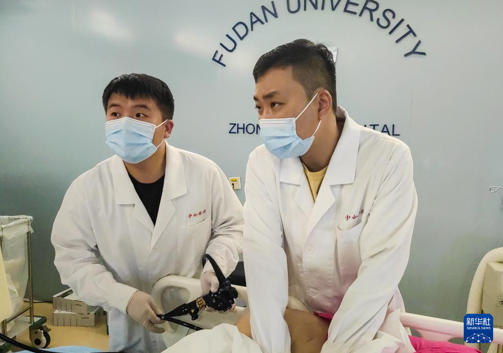 在復旦大學附屬中山醫(yī)院,段穎騫(左)在老師胡健衛(wèi)的指導下進行內(nèi)鏡手術(6月26日攝)。新華社記者 龔雯 攝