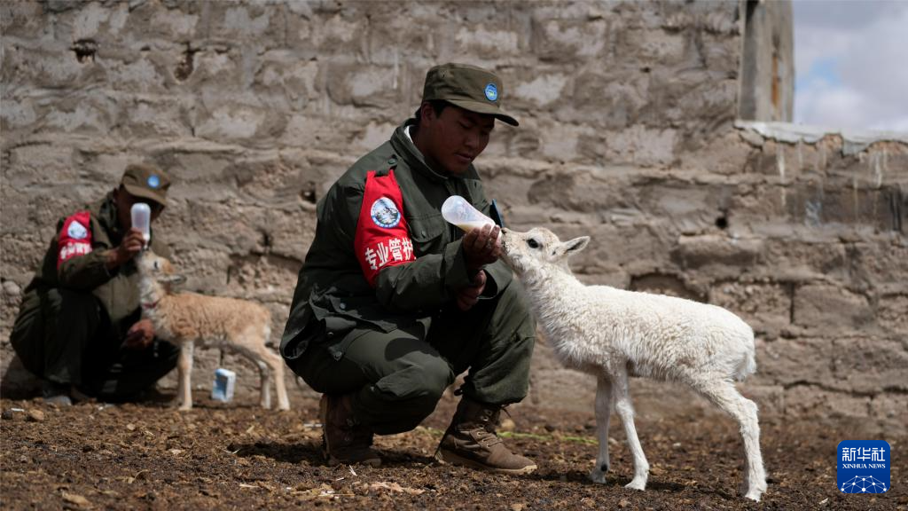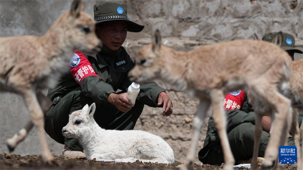 尼瑪縣措羅木管護站野保員在給白色藏羚羊幼崽喂奶(7月13日攝)。新華社發(fā)(旦增攝)