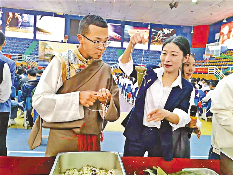 安徽援藏隊(duì)員手把手教山南二高學(xué)生包粽子。