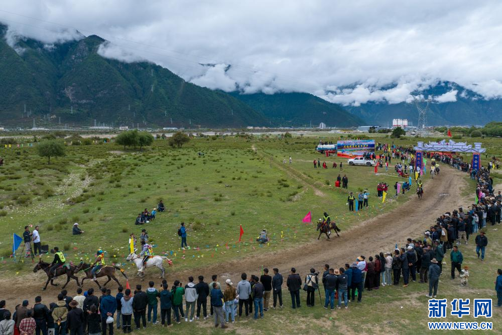 西藏林芝市林芝鎮(zhèn)第七屆尼洋旅游文化之民俗賽馬藝術(shù)節(jié)活動現(xiàn)場(7月22日攝,無人機照片)。新華網(wǎng) 旦增努布 攝