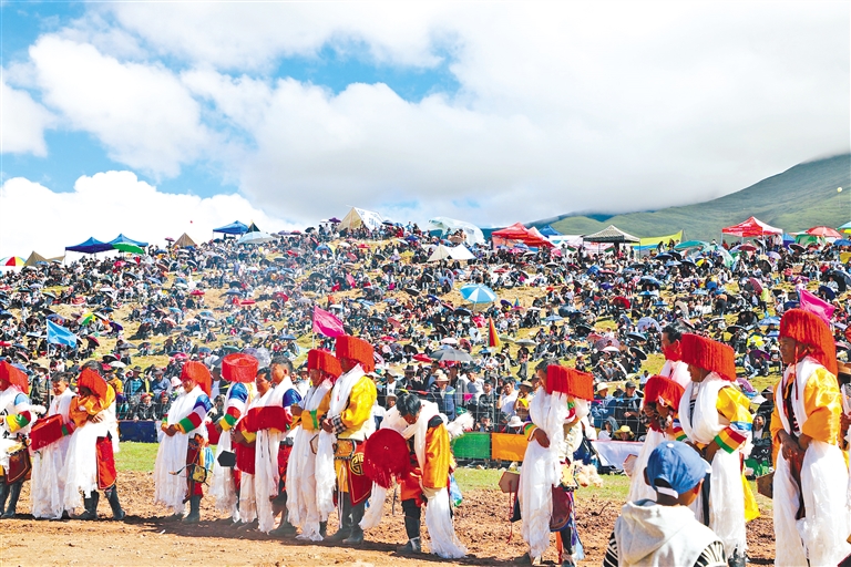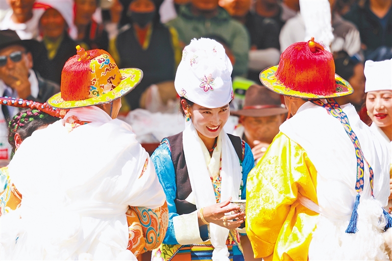 夏季的林周縣碧草如茵、風景如畫、青稞飄香,也迎來了農忙時節(jié)最為熱鬧的節(jié)日——“望果節(jié)”。“望果節(jié)”是國家級非物質文化遺產,是藏民族歡慶豐收的傳統(tǒng)節(jié)日,已有1500多年歷史。此時,當?shù)厝罕姸紩┥瞎?jié)日的盛裝,歡度一年一度的“望果節(jié)”,欣賞文藝演出、觀看賽馬比賽,歡慶豐收、歌頌美好生活,祈福風調雨順、國泰民安、五谷豐登、吉祥如意。
