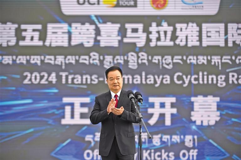 8月21日上午,2024中國(guó)西藏第五屆跨喜馬拉雅國(guó)際公路自行車極限賽在拉薩市布達(dá)拉宮廣場(chǎng)隆重開(kāi)幕。這是自治區(qū)黨委書(shū)記王君正出席開(kāi)幕式并宣布本屆比賽開(kāi)幕。 本報(bào)記者 李洲 攝