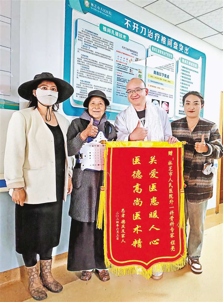 圖為患者康復(fù)后為援藏醫(yī)生贈送錦旗表達(dá)感謝。(圖片由林芝市人民醫(yī)院提供)