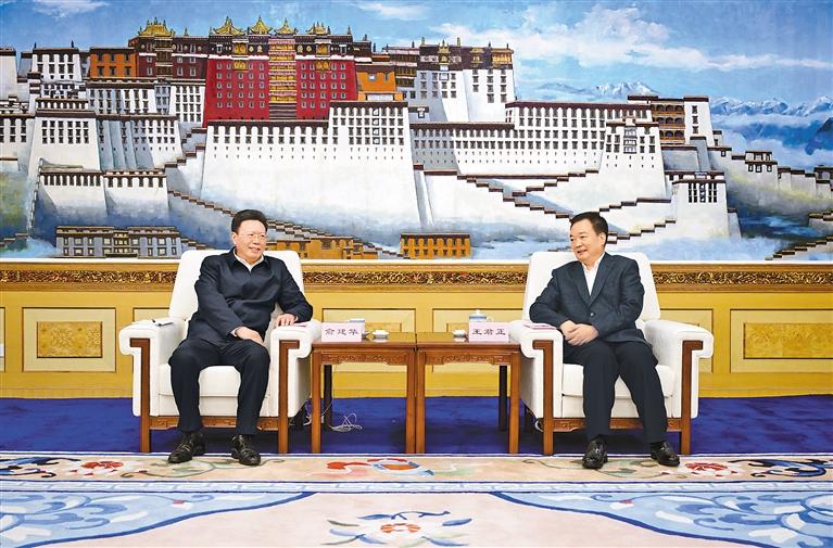 29日上午,自治區(qū)黨委書記王君正在拉薩與海關總署署長、黨委書記俞建華一行座談。