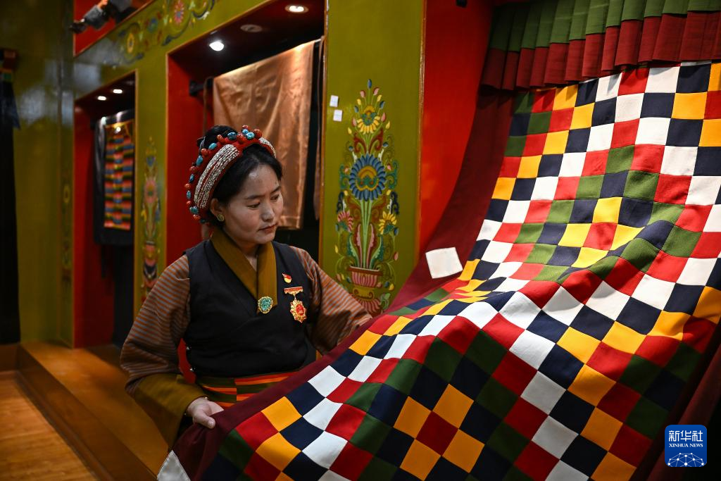 9月1日,在西藏日喀則市仁布縣特色產(chǎn)業(yè)孵化園,亞德細(xì)褐紡織手工藝傳承人南木珍查看展示的紡織品成品。新華社記者 孫瑞博 攝