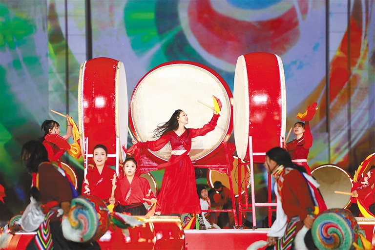 共振共鳴中國鼓,交流交融民族情。在激昂的鼓聲和大開大合的舞姿中,開幕式序曲《大江之鼓》緩緩呈現(xiàn)在所有人面前。喆友打擊樂團(tuán)、山南市瓊結(jié)久河卓舞隊等隊伍的近70名鼓手同臺獻(xiàn)藝、默契配合,讓鼓聲共振、情感共鳴,展現(xiàn)了激情洋溢、魅力無限的中華鼓文化。