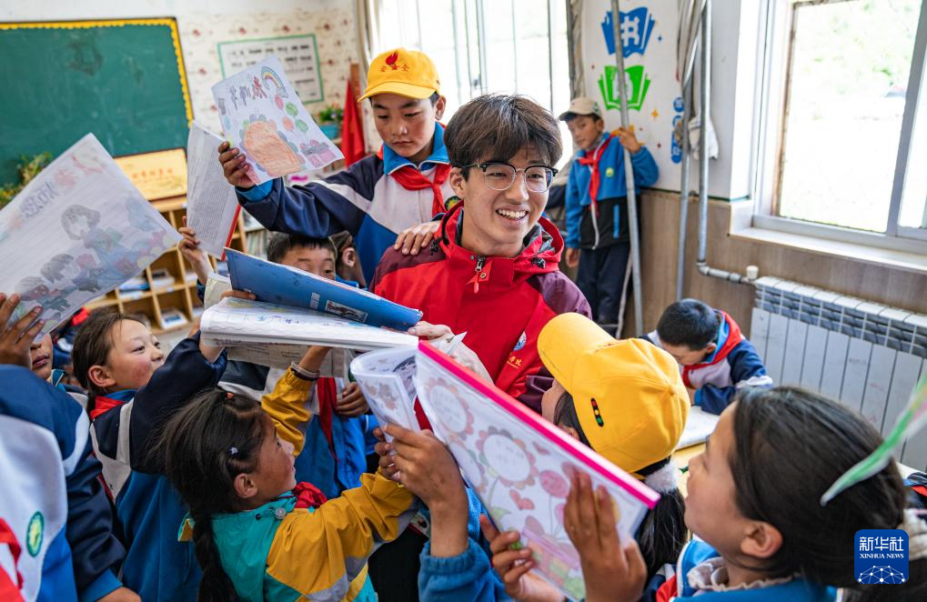 在娘蒲鄉(xiāng)中心小學(xué),孩子們把自己做好的手抄報展示給胡正培(9月3日攝)。新華社記者 丁增尼達(dá) 攝