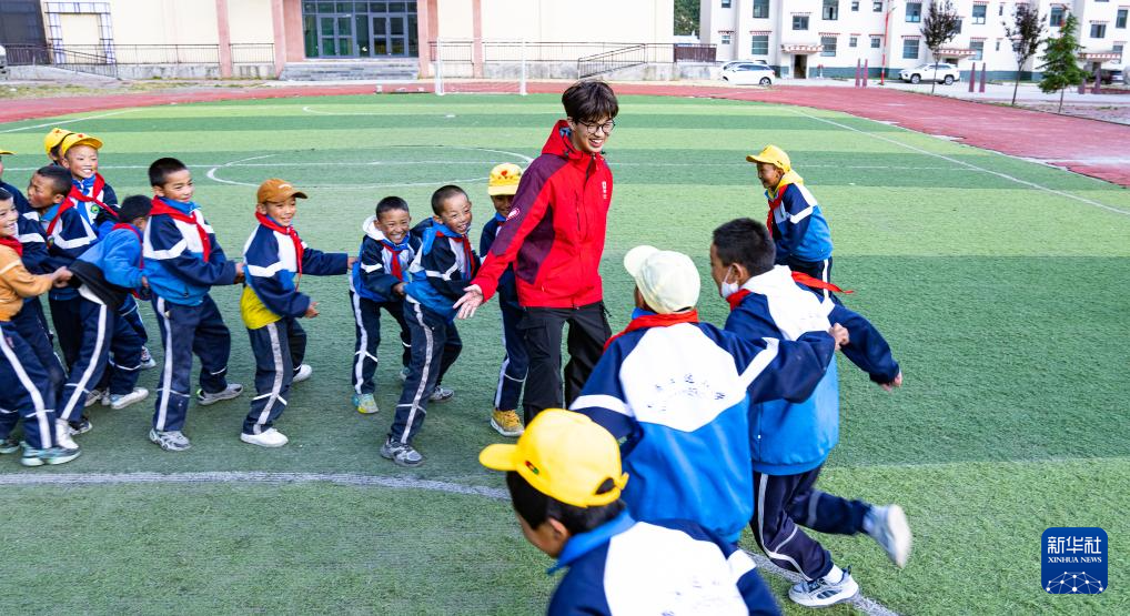 在娘蒲鄉(xiāng)中心小學(xué),嶺南師范學(xué)院支教隊成員胡正培課間與孩子們玩耍(9月3日攝)。新華社記者 丁增尼達(dá) 攝