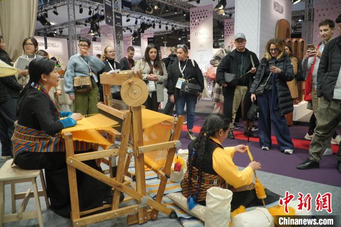 2024年1月,來自中國西藏的傳統(tǒng)氆氌亮相法國巴黎時尚家居設計展。(受訪者供圖)