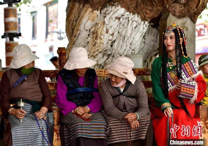 圖為9月7日游客在八廓街拍攝藏服寫(xiě)真。中新社記者 李林 攝