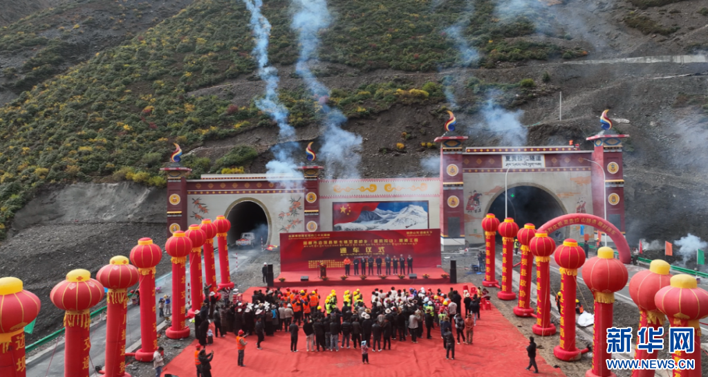 這是夏貢拉山隧道通車儀式現(xiàn)場(9月29日攝,無人機照片)。新華社發(fā)