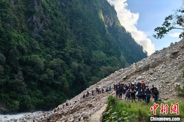 圖為吉隆出入境邊防檢查站民警帶領(lǐng)滯留尼籍邊民通過塌方路段前往吉隆口岸。郭章統(tǒng) 攝