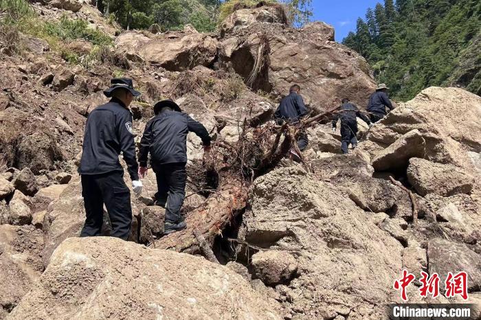 圖為吉隆出入境邊防檢查站民警前往塌方路段接引尼籍邊民到吉隆口岸。郭章統(tǒng) 攝