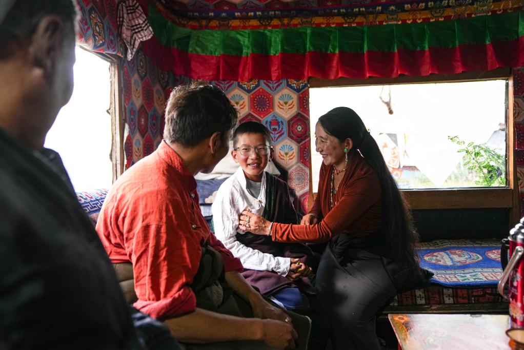 在夏季牧場(chǎng)的房子里,貢喬熱旦的母親阿吉(右一)整理兒子的藏裝(9月4日攝)。新華社記者 晉美多吉 攝