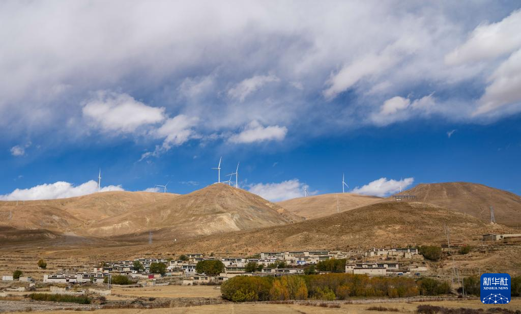 10月17日拍攝的位于西藏日喀則市薩迦縣的風(fēng)力發(fā)電機組及山腳下的村莊。新華社記者 晉美多吉 攝?