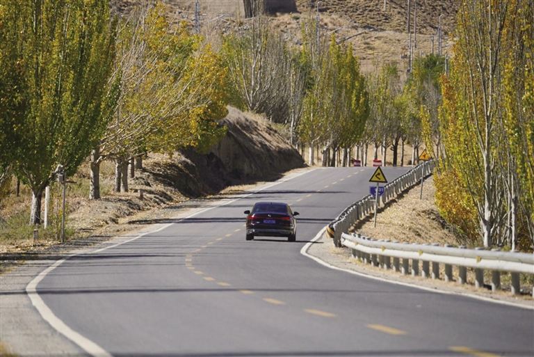 從拉薩市區(qū)出發(fā),沿著G318一路向西,車輛行駛在寬闊的大道上。江水靜靜流淌,遠(yuǎn)處的雪山在晨光中若隱若現(xiàn),與近處錯落有致的藏式建筑交相輝映。道路兩旁滿是金黃色的樹木,車輛穿梭在金色的大道上,落葉在地面旋轉(zhuǎn)飛舞,仿佛進(jìn)入時(shí)空隧道一般。