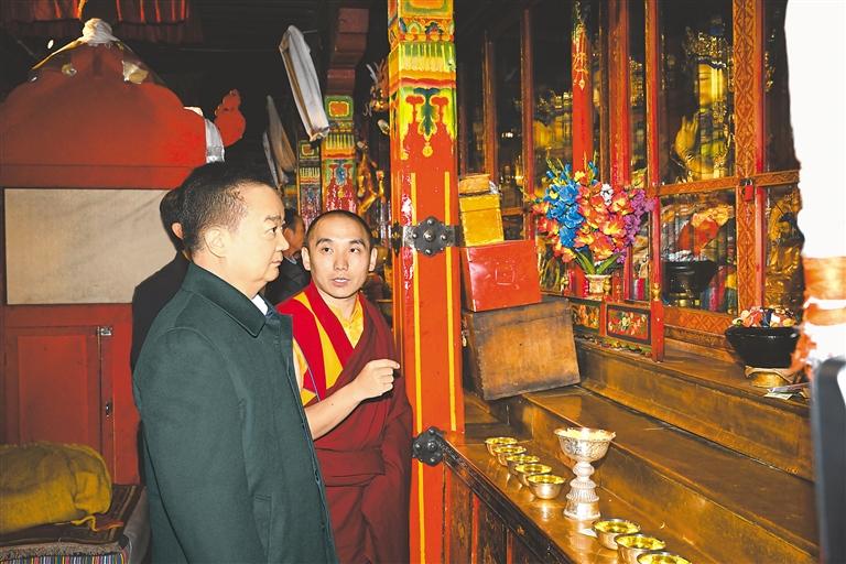 王君正深入寺廟開展調(diào)研,與僧尼親切交流。扎西吉培寺坐落于謝通門縣,歷史悠久、氣勢(shì)恢宏。王君正來(lái)到這里,詳細(xì)了解該寺加強(qiáng)和創(chuàng)新寺廟管理、寺廟歷史、文物保護(hù)等情況,聽取“三個(gè)意識(shí)”教育工作開展情況匯報(bào)。指出,要進(jìn)一步深化拓展“三個(gè)意識(shí)”教育,總結(jié)提升好經(jīng)驗(yàn)好做法,對(duì)該寺結(jié)合實(shí)際建立“六項(xiàng)機(jī)制”,完善僧尼綜合考核,推動(dòng)僧尼實(shí)現(xiàn)自我教育、自我管理、自我約束等工作進(jìn)行總結(jié)提煉、不斷完善;依法加強(qiáng)宗教事務(wù)管理,掌握宗教工作科學(xué)方法,推動(dòng)宗教事務(wù)管理法治化、規(guī)范化、常態(tài)化,強(qiáng)化寺管會(huì)工作職能,加強(qiáng)寺管會(huì)干部隊(duì)伍建設(shè),推動(dòng)宗教工作由“管得住”向“管得好”轉(zhuǎn)變。王君正在考察了解到該寺珍藏著《甘珠爾》《丹珠爾》等文物古籍時(shí)指出,要加強(qiáng)文物古籍保護(hù)利用,切實(shí)提高文物保護(hù)的科技含量和裝備水平,讓珍貴古籍、文物資源煥發(fā)新生、世代傳承,留住歷史的痕跡和文明的根脈。王君正對(duì)該寺組織僧尼前往區(qū)外學(xué)習(xí)參觀感到高興,指出,加強(qiáng)西藏宗教界與區(qū)外交流學(xué)習(xí)是鑄牢中華民族共同體意識(shí)的具體體現(xiàn),對(duì)于深入推動(dòng)各民族交往交流交融將起到積極促進(jìn)作用,必將進(jìn)一步構(gòu)筑中華民族共有精神文化家園。
