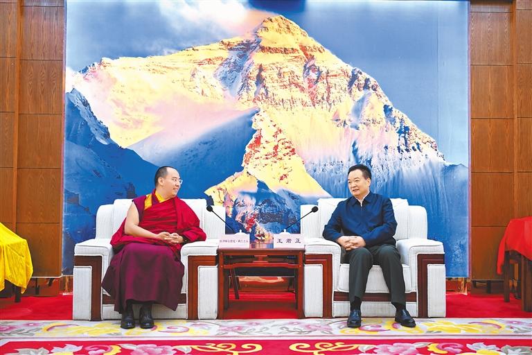 調(diào)研結(jié)束后,王君正在日喀則市會(huì)見了班禪額爾德尼·確吉杰布,對(duì)其在藏各項(xiàng)活動(dòng)的順利開展、圓滿成功表示祝賀。王君正指出,班禪額爾德尼·確吉杰布回藏履職以來(lái),深入貫徹習(xí)近平總書記關(guān)于宗教工作、西藏工作的重要指示和新時(shí)代黨的治藏方略,深入學(xué)習(xí)宣傳“三個(gè)意識(shí)”,廣泛接觸基層干部群眾和寺廟僧尼,積極宣傳黨的民族宗教政策,在推進(jìn)藏傳佛教中國(guó)化、鑄牢中華民族共同體意識(shí)、引導(dǎo)信眾投身社會(huì)主義現(xiàn)代化新西藏建設(shè)等方面做了積極有效的工作。希望班禪額爾德尼·確吉杰布進(jìn)一步學(xué)習(xí)領(lǐng)會(huì)習(xí)近平總書記重要指示精神,堅(jiān)定不移維護(hù)祖國(guó)統(tǒng)一、加強(qiáng)民族團(tuán)結(jié),全力維護(hù)社會(huì)和諧穩(wěn)定的良好局面;堅(jiān)定不移推進(jìn)藏傳佛教中國(guó)化,對(duì)教規(guī)教義作出通俗易懂、與時(shí)俱進(jìn)的闡釋;堅(jiān)定不移深化拓展“國(guó)家意識(shí)、公民意識(shí)、法治意識(shí)”教育,把各方面力量凝聚起來(lái),奮力推進(jìn)社會(huì)主義現(xiàn)代化新西藏建設(shè)。