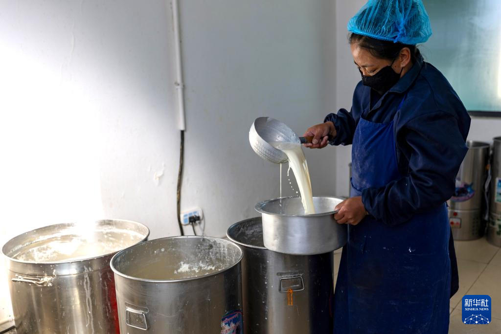 11月28日,在基地就業(yè)的當?shù)貑T工索朗卓瑪在用傳統(tǒng)工藝制作奶渣。新華社記者 姜帆 攝