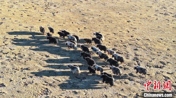 12月12日,西藏自治區(qū)那曲市安多縣帕那鎮(zhèn)牧民土巴卓瑪家的牦牛。(無人機照片)中新社記者 薛蒂 攝