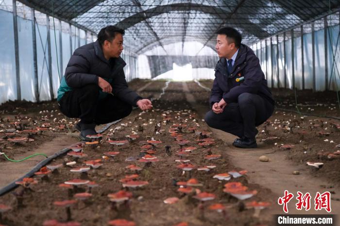 圖為12月11日,中國(guó)農(nóng)業(yè)銀行米林市支行營(yíng)業(yè)室主任尼瑪丁增(右)在大棚內(nèi)了解農(nóng)場(chǎng)生產(chǎn)經(jīng)營(yíng)等情況。記者 江飛波 攝