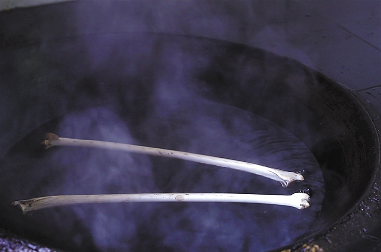 圖為技藝師正在用鐵絲清理骨頭里面殘留的碎渣。