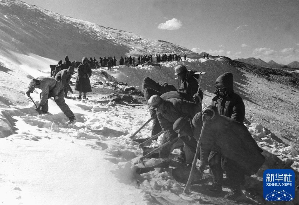 1952年,筑路民工在甲皮拉山頂鏟除冰雪,讓汽車通過。新華社記者 趙慎應 攝