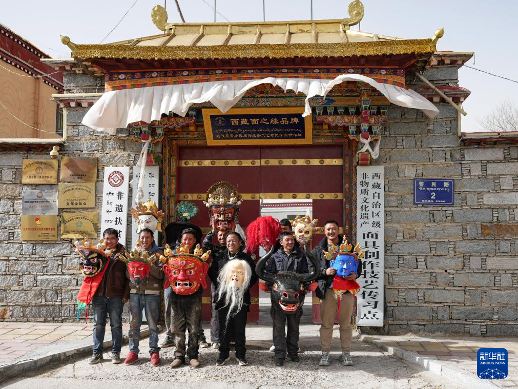 12月9日,拉薩達(dá)孜區(qū)雪鄉(xiāng)民間傳統(tǒng)手工藝農(nóng)民專業(yè)合作社的面具制作工匠們在合作社門口合影。新華社記者 晉美多吉 攝