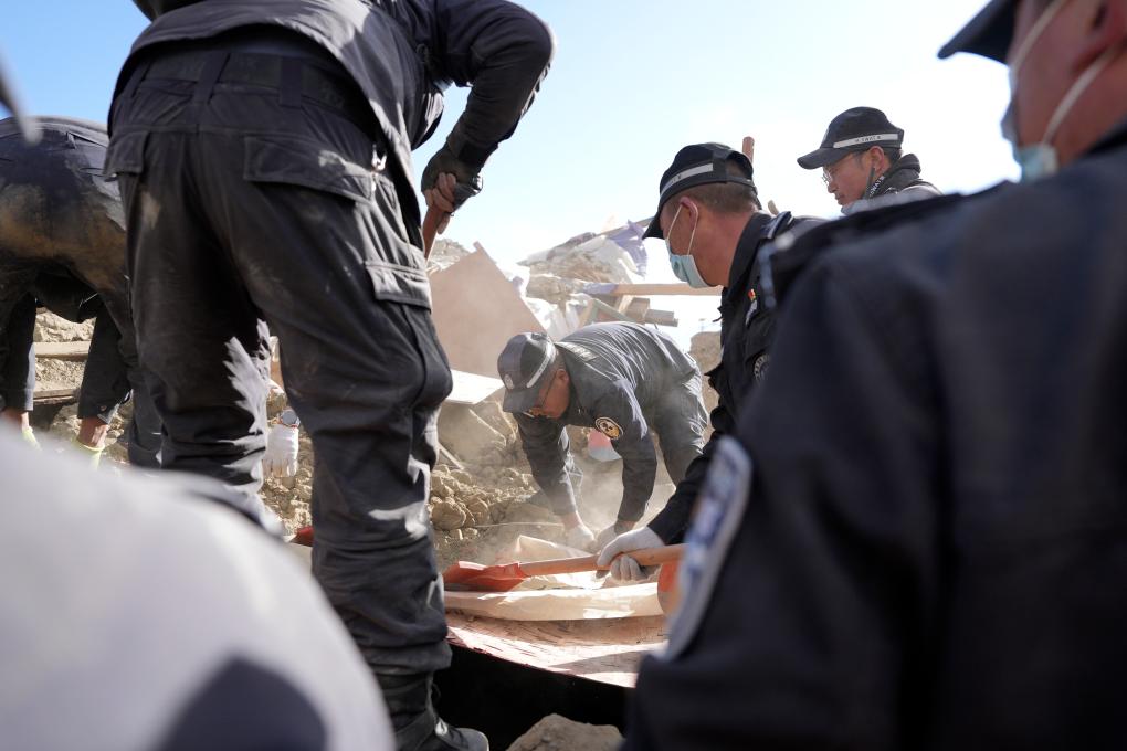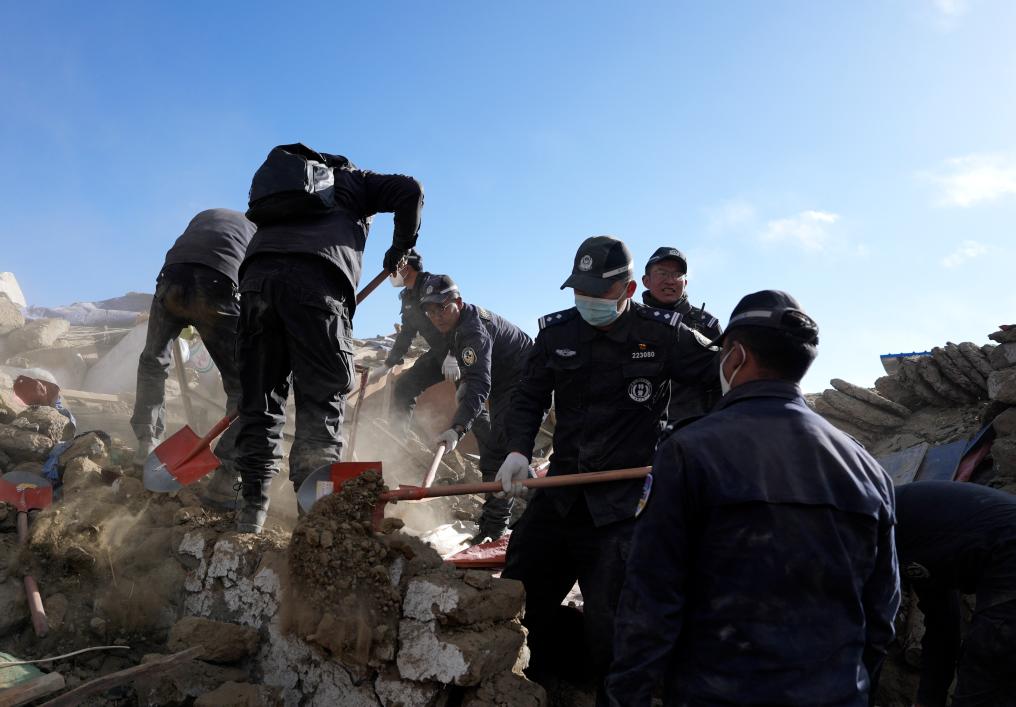 1月7日,救援人員在定日縣長所鄉(xiāng)古榮村進行搜救。