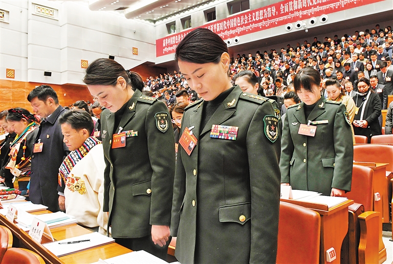 大會(huì)開(kāi)幕前,全體人員起立,向地震中不幸遇難的同胞默哀。記者 旦增蘭澤 攝