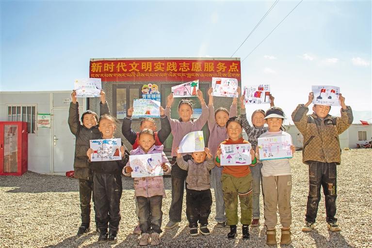 圖為定日縣長(zhǎng)所鄉(xiāng)嘎旦村的孩子們展示自己畫(huà)。記者 馬曉艷 旦增嘎瓦 攝