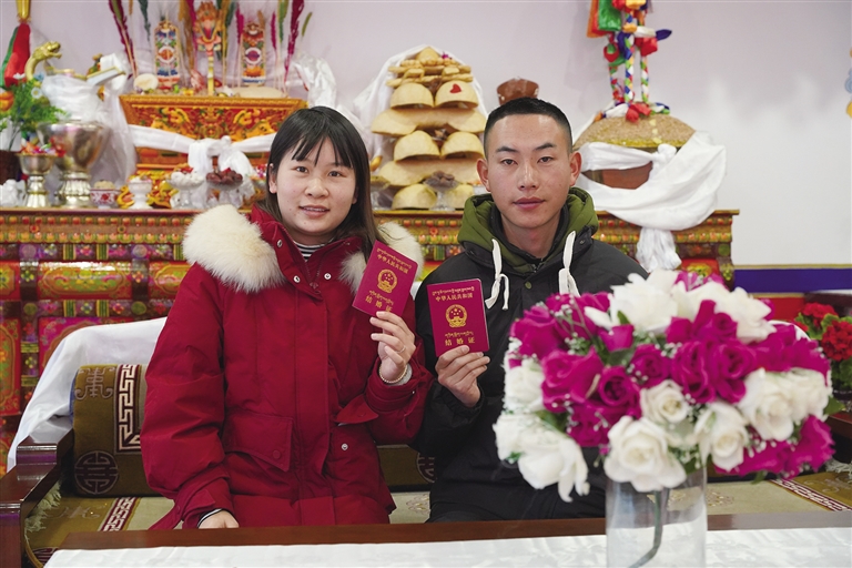 “我們在一起3年了,是表姐牽的紅線?!钡┰龈峦吣樕涎笠缰腋5男θ?,緩緩說道,“初次見到卓嘎,我就對她心生好感。相處一段時間后,我發(fā)現(xiàn)她性格溫柔,和我特別合拍,于是鼓起勇氣向她表白。”他開心地展示著剛剛領(lǐng)到的結(jié)婚證,“情人節(jié)是個好日子,我們早就計劃好今天領(lǐng)證,現(xiàn)在終于如愿以償。以后情人節(jié)和結(jié)婚紀(jì)念日合二為一,既能少買一份禮物,也不用擔(dān)心忘記啦?!?/p>