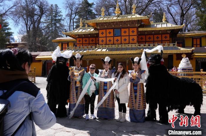 圖為歡迎儀式現(xiàn)場(chǎng),香港游客在羅布林卡與身著拉薩傳統(tǒng)服飾的工作人員合影留念。中新社記者 李林 攝