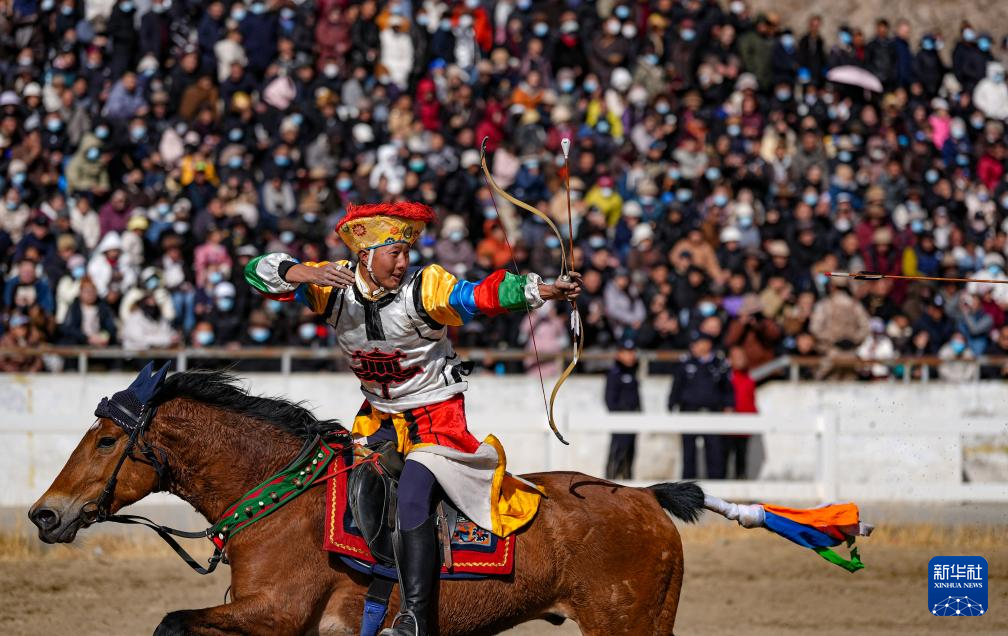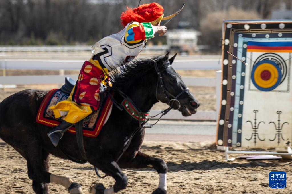3月2日,馬術(shù)隊員在表演傳統(tǒng)馬術(shù)項目馬上射箭。新華社記者 晉美多吉 攝