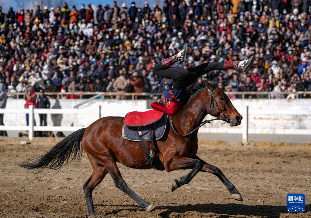 3月2日,馬術(shù)隊(duì)員在表演傳統(tǒng)馬術(shù)項(xiàng)目撿碗。新華社記者 晉美多吉 攝