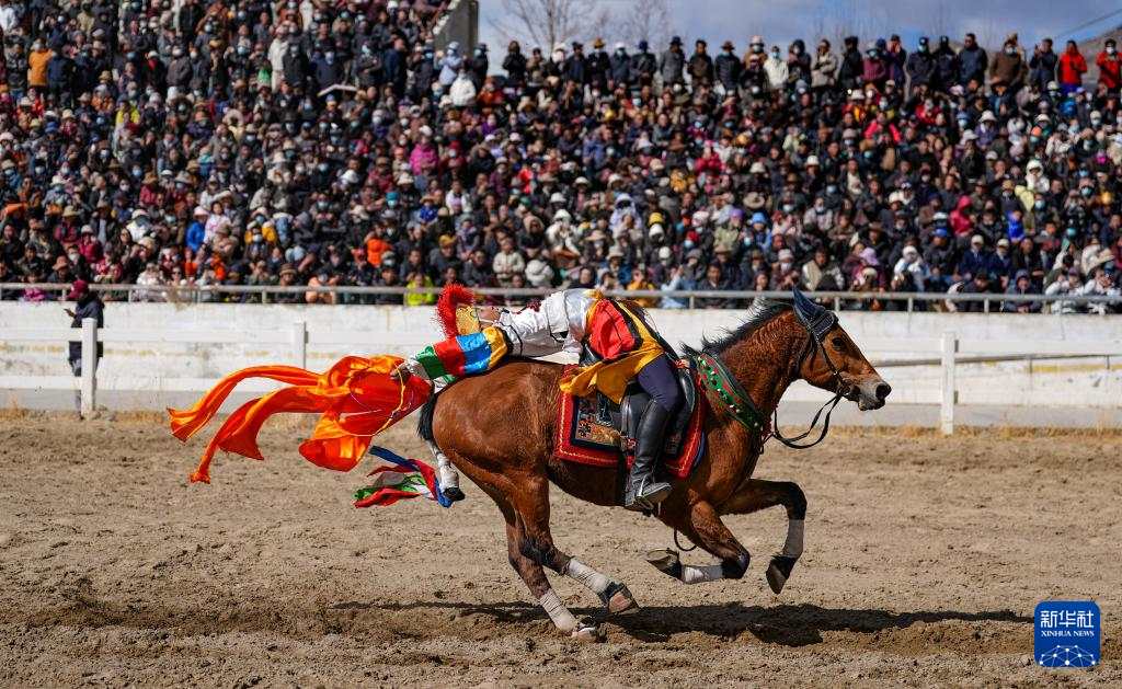 3月2日,馬術(shù)隊員在表演傳統(tǒng)馬術(shù)項目撿哈達(dá)。新華社記者 晉美多吉 攝