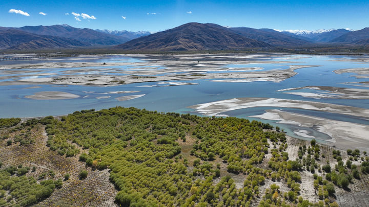 這是雅魯藏布江寬闊的河床和岸邊種植的樹木(2024年10月24日攝)。新華社記者 晉美多吉 攝